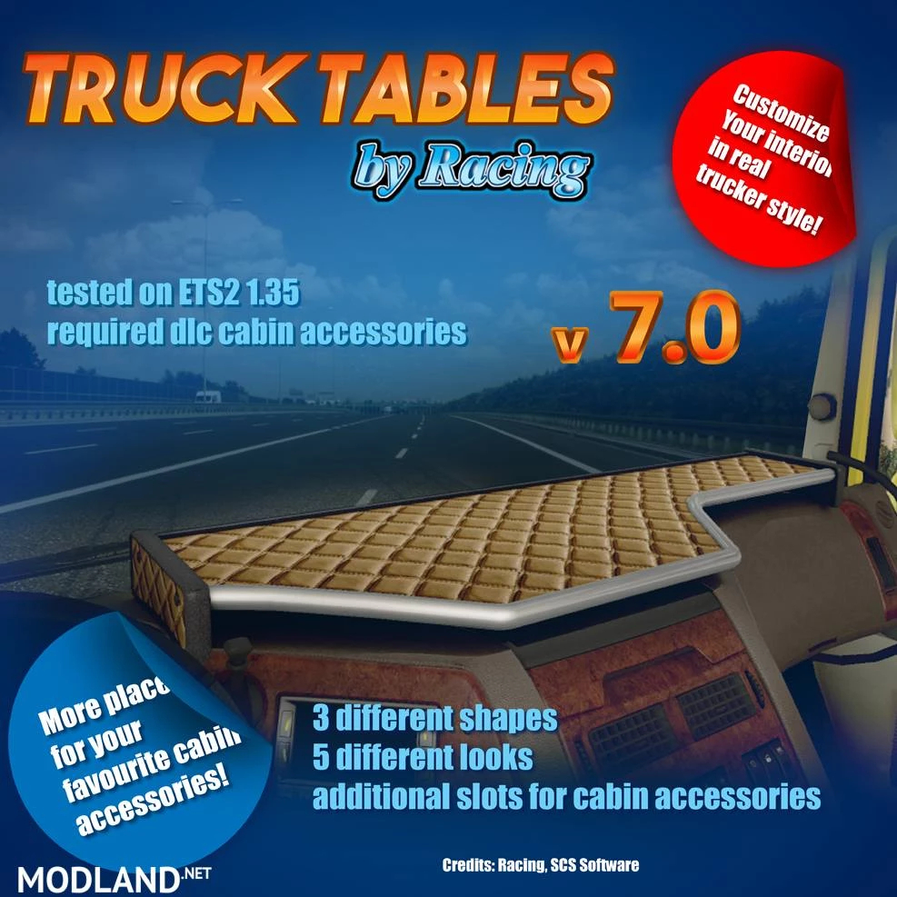 – mod contains truck tables for Daf XF 105, Daf XF Euro6, Iveco Hiway, Iveco Stralis, Man TGX, Man TGX Euro6, Renault Magnum, Renault Premium, Renault T, Scania R & Streamline,
