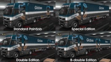 Also included are four different trailer paintjobs. The standard paintjob (just called “Globex Paintjob”) can be used with any trailer setup. The Special Edition is specifically designed for single trailers, and matches up with the logo on the trucks’ paintjobs. There is also a Double Edition and a B-double Edition, designed for double and b-double trailer setups respectively.