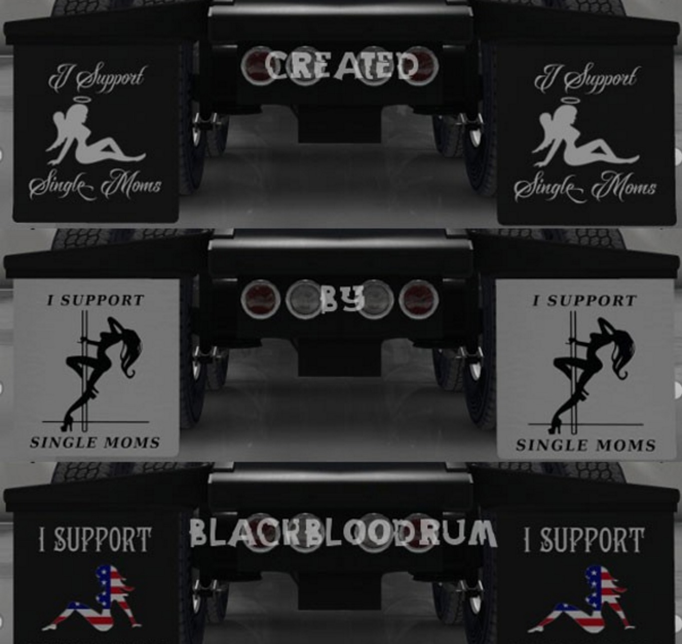 This pack contains 50 various “I Support Single Moms” mudflaps for entertainment purposes which will allow you to customize your truck mudflaps in a more entertaining way.
