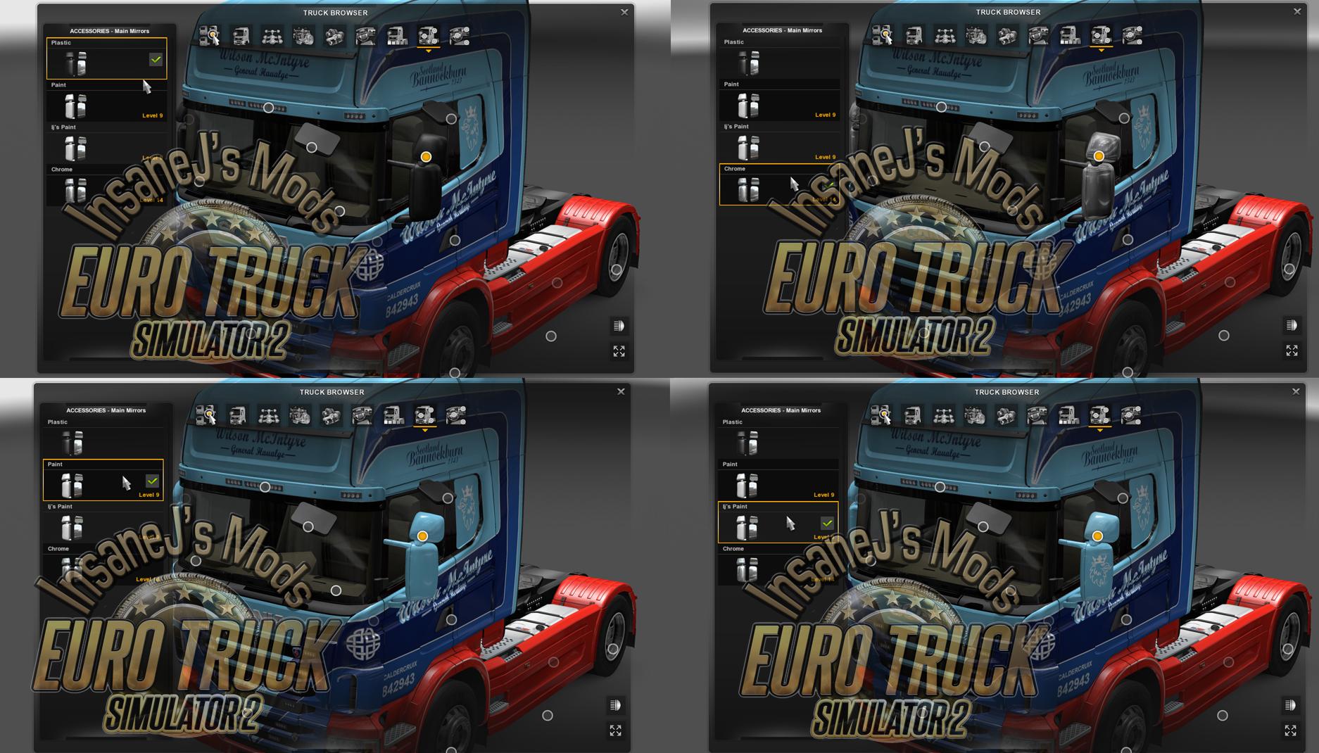 I have also removed the side mirror and wing mirrors. The wing mirrors now allow the use of SCS mirrors (Plastic/Chrome/Paint) as well as adding a new fourth option to allow full skinning.
