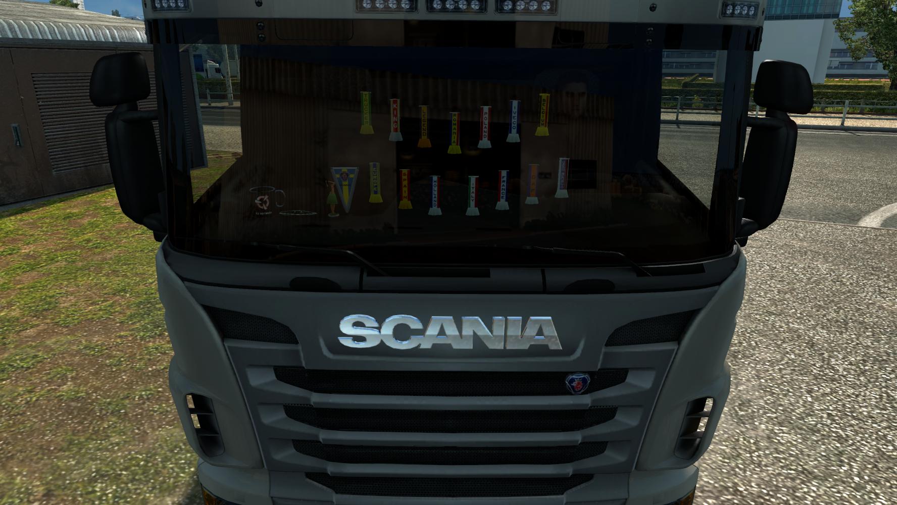 This is my new version of the mod add more than a skins for scarfs and pennants, he add new slots interior for man_tgx, daf_xf, scania. New mugs (one skin man, one volvo, daf…) and add cigarettes.