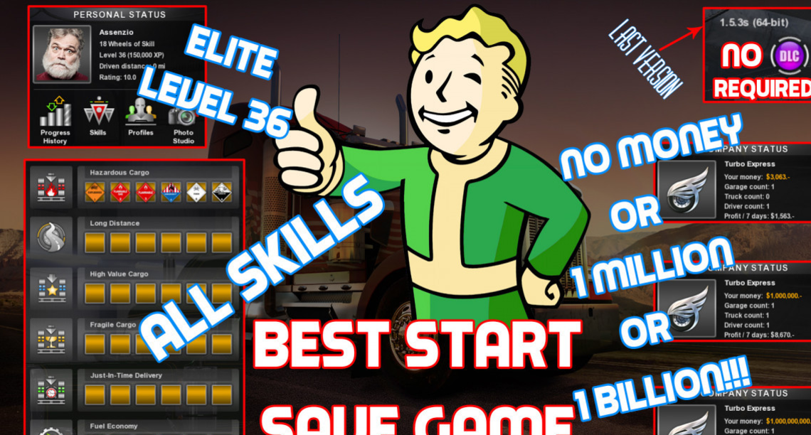 This is a starter save game for ATS beginners (and not). Perfect if you want to play ATS with already a lot of money and all the skills or only with all skills.