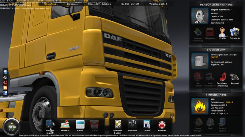 settings). 4 zzSorglosby_Icemann_texturen Mod 1 and 4 belong together and have both in the mod folder Mod 2 and 3 are for editing open and optional equipment The order of mods may not be changed so that it runs without errors Modified in the game were: – real service stations – Job Market is Randstadt – changed driving physics and adapted to the new Physics of Patch 1.16.2 – It is about 21 clock dark and light again at about 5am – street lighting changed – Econemy data revised – The translations (axes) and transitions of all trucks except Iveco Highway , a new Volvo in 2012 and Euro 6 Daf meet now the original technical data. Newly tuned to Patch 1.16.2 ZB – Daf XF 105.510 = Daf – Renault Premium = Premium Route 460 181 18T – Renault Magnum Magnum 460.18T Euro5 = – = MAN XXL 18.430 – Mercedes Actros Megaspace = 1855LS Euro5 – Scania R = Scania R Topline – Scania R Topline Streamline = Scania – Volvo 2009 = Globetrotter XL – Iveco STRALIS = 190S..FP-CM – Smaller interior mirror on both sides are in there too. – The Interior of all trucks is adapted. Incl. new camera angles for all trucks, the driver can now also look out the passenger window to rear – HD textures of Traffic car chassis part with real brands – HD textures of most trailer Chassis – New roads textures – New dealer and workshop texture – increased reversing light beam range – revised Blink barks, now flashing in sequence – penalties approximately customized according Bußgeldkatalog – speeds of all countries so adjusted as is practicable in accordance with the laws – street lighting and times changed – Globetrotter illuminated sign on the roof is again Illuminated – new train – Partial new road posts with reflective cat’s eye – Partial new guardrails with reflective cat’s eye – Partial new concrete blocks with reflective cat’s eye – New gas stations signs and changed prices (signs with a foreign currency are presented with course from 04/27/14 converted into euros) – changed Streamline gear ratio – Streamline headlight range Revision – all Scania chassis reduced suspension travel – new roadblocks in the non-navigable roads – traffic density increases (now happen from time to time accidents and there is little congestion) – With the help of a friend Lamandus (Delirium <- he was his advisor) I have all the characteristics of Germany, Austria, Poland and Switzerland can build. WITH MISSING PROVINCES! Lower Austria and Vorarlberg! He has inserted the coat of arms and work perfectly! The Viennese license plates are especially and were also adjusted accordingly! For Poland now I've also created a new indicator. – Some other things Fix for V26 – on Patch 1.16.2 adapted – Weather revised and adapted to Patch 1.16.2. Day Night amended regulation from approx.19: 00 clock dusk and dark by 21 clock, from about 5 clock dawn and about 7 clock light – some new textures (eg roads, Sky, vegetation, buildings, etc.) – symbols at service stations , dealers, etc. replaced with various manhole covers – menu, Tuning, traders symbols, etc. replaced – Many icons of PDA newly incl new colors of the routes. – new lights of the truck, trailer (incl. strobe lights) and all other Ai vehicles, are now of an even greater distance to recognize – gear ratio for the Scania T of Henki73 created and tailored to the data of the Scania Topline. Now the 12 transition and about 1300-1400 U / min are at 80 km / possible modified headlight range for Scania T – Various other changes Hope you enjoy it and have fun. And for all the gripe about the file size, the need Skins maintenance much MB to reasonably look good. And one more little thing, you can not please everyone and I do not want too. I'm doing this done just for me according to my wishes and parts it just with you. Does not work with other mods that access level, game data or light installation:. 1 Ensures that you have the version 1.16.2. For this you start the game and in the Profile drop-down menu you can see at the bottom of your version number. 1.1 Should not have version 1.16.2 (displayed in the game as 1.15.1) there, invite you to the http://eurotrucksimulator2.com/update.php latest patch down. 1.2 now leads the patch application made by her, it starts with a double-click. Now you follow the instructions until the update process is finished.. 2 Invites you now the new carefree package from the sources indicated below down.. 3 Backs up your old scores. To use the Easy Mod, you should create a new score. 3.1 For this you go to "My Documents", then "Euro Truck Simulator 2" and finally "profile". The folder you copied is now existing there in a backup folder that you have previously created you, for example on the desktop.. 4 Ensures that you, once removed all the mods that you have used to date. You can then gradually insert after again to test if the mods are compatible.. 5 Now open with a double click the downloaded Carefree-Mod (this you need 7zip or a similar program) and draws the "Sorglos.scs" the files you need into your "mod" folder. The SCS zzSorglosby_Icemann_defs and zzSorglosby_Icemann_texturen are needed which scs zzSorglosby_Icemann_defsTSM and zzSorglosby_Icemann_physics is optional. 6 Now you start the game.. 7 Creates a new game, so that the Mod is working properly and do not forget the heels.. 8 Adds now (if you want) a more mods; but checked in advance whether they are compatible with the carefree Mod.. 9 Enjoy the game 🙂 Please remove all other mods only, and then the paste again what you want to have.