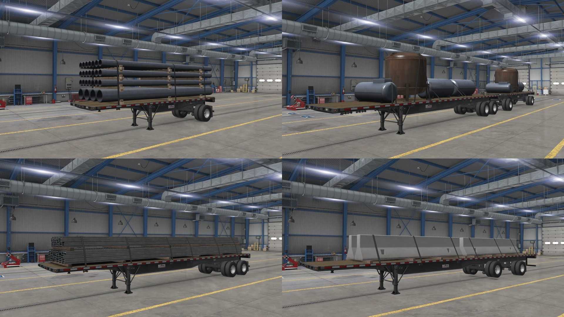 This mod aims to add the so-much-needed variety to the flatbed cargo, providing a bit better experience when hauling flatbed cargo. The mod adds new variants to the original cargo, as well as brand new cargo (some of them are also ported from ETS2).