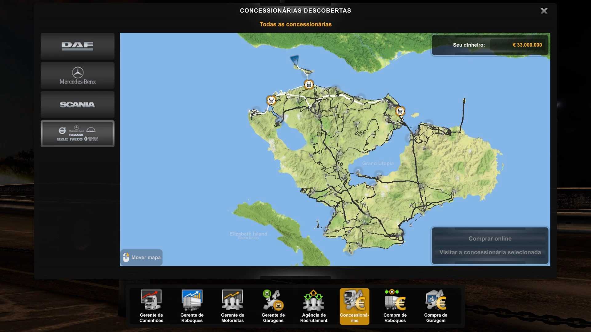 GARAGE 55 TRUCKS 50 DRIVERS 50 TRAILERS 10 MONEY 33.000.000 MAP EXPLORED 7.04%