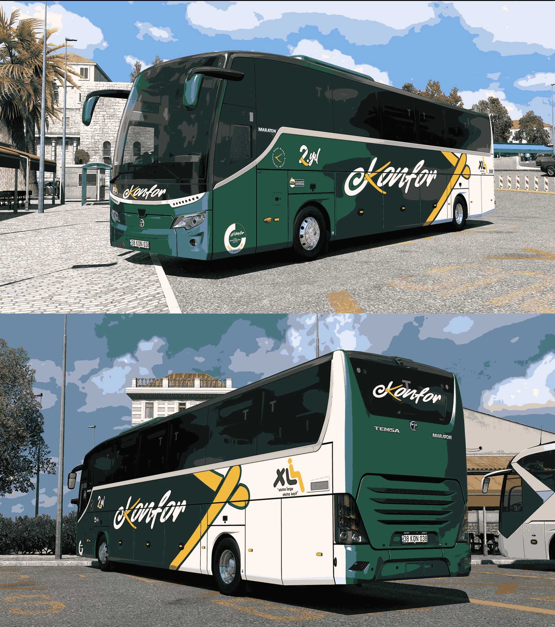 I am with the Temsa Maraton Euro 6 model Konfor Turizm Skinpack Coating, one of the Heavy Vehicles Turkey mods. It is available in Custom Template-1. Colors other than white are not recommended. You can also join the Konfor Turizm family and become a Virtual Bus Driver.