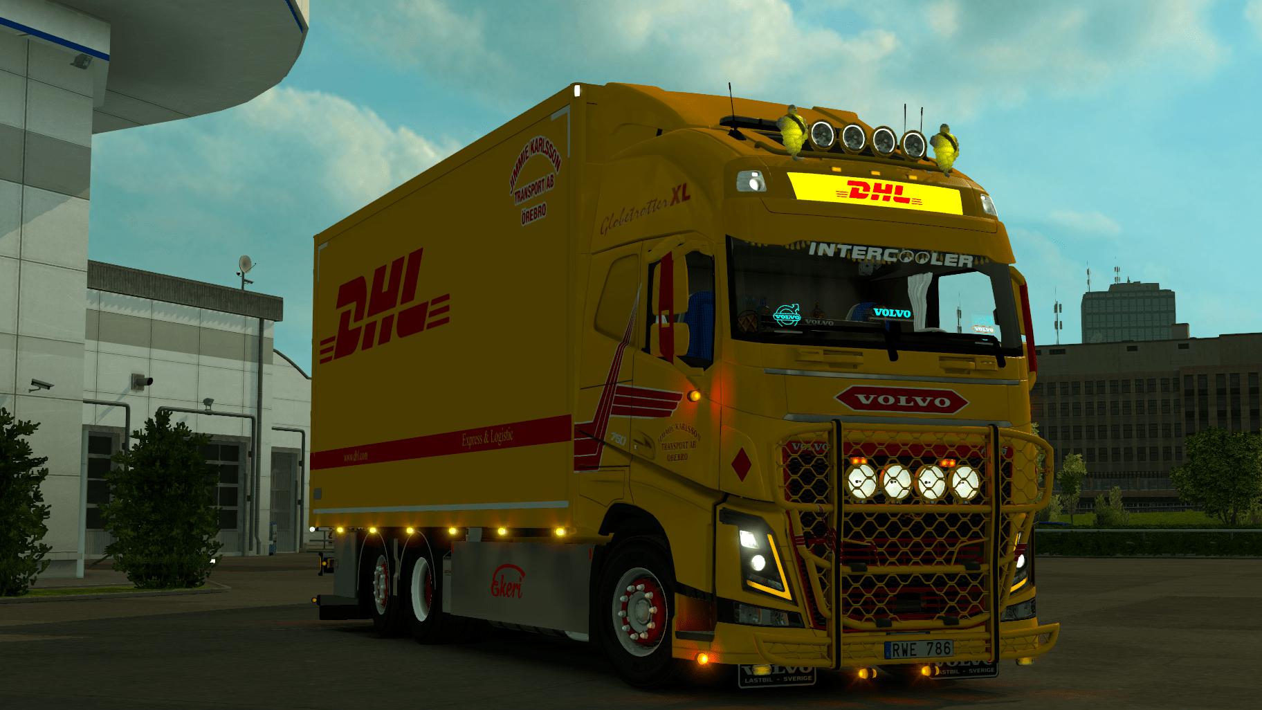 DHL Jimmie Karlssons skin for Volvo by Eugene Ekeri 4,4m tandem with ownable Ekeri 4,4m trailer and forehead lightbox,mods needed : Tandem addon for RJL Scania rs&r4 by Kast v1.9.2, Rigid Chassis Addon for Eugene’s Volvo FH&FH16 2012 v1.3 – ByCapital,Ekeri semi/full-trailers, Ekeri tandem addon, MBL Volvo Addon Pack v 1.2.1…thanks to CargoTLNLukas for base mod and to AddyJ for trailer.